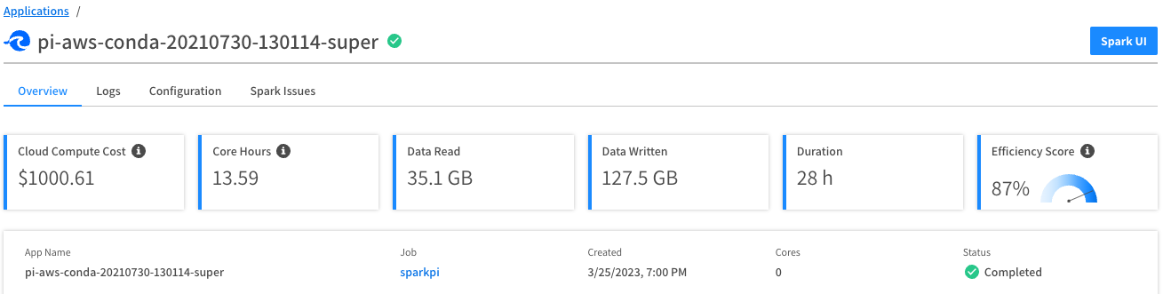 To drill down into the details about your Ocean for Apache Spark application, start with the Overview tab, which gives you quick access to insights and summary data about the application. You can obtain an overview of your current cost, efficiency status, app metrics, and access to logs. You can view more details about the app in additional tabs including its configuration and a listing of Spark issues.