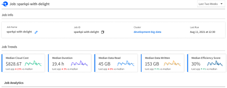 To drill down into the details about your Ocean for Apache Spark job, start with the Overview tab, which gives you quick access to insights and summary data about the job. You can obtain an overview of your cost trend and other related trends, job analytics, and status of applications relevant to this job.