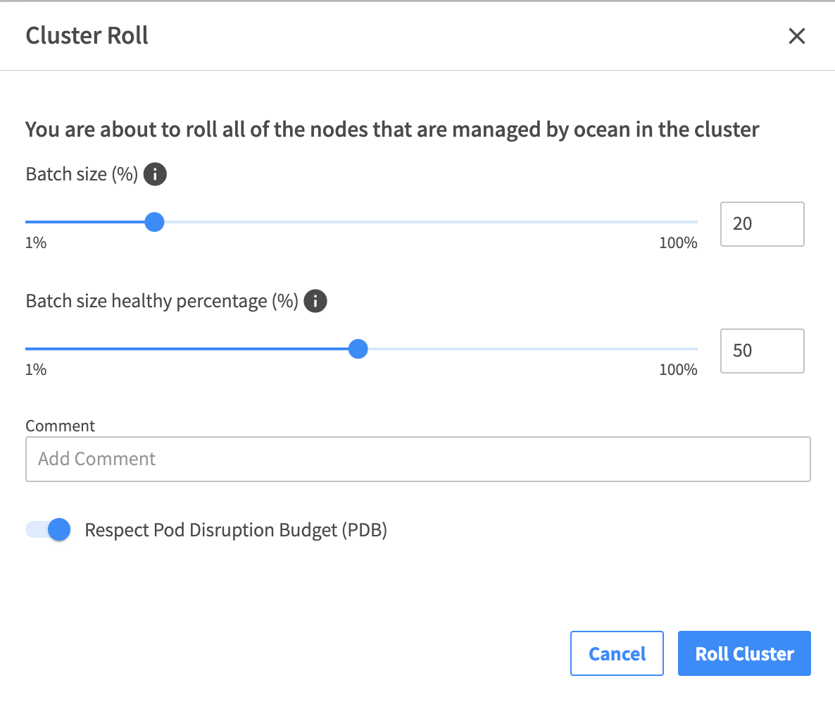 • Batch Size: Indicates how much will be rolled at a time. This value is a percentage of the cluster's target capacity.